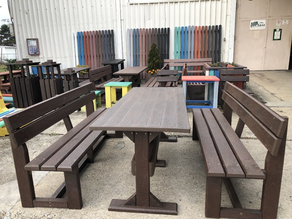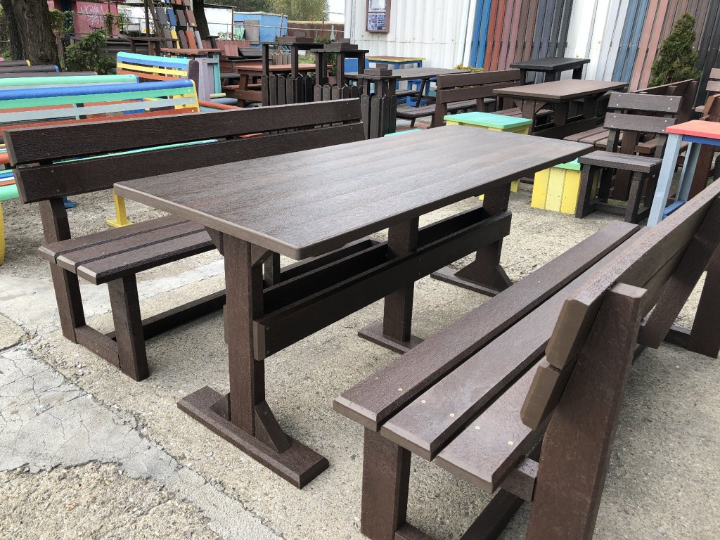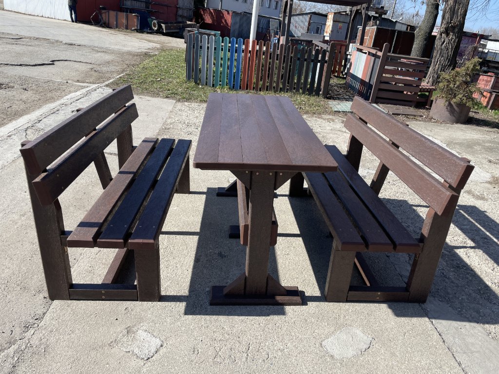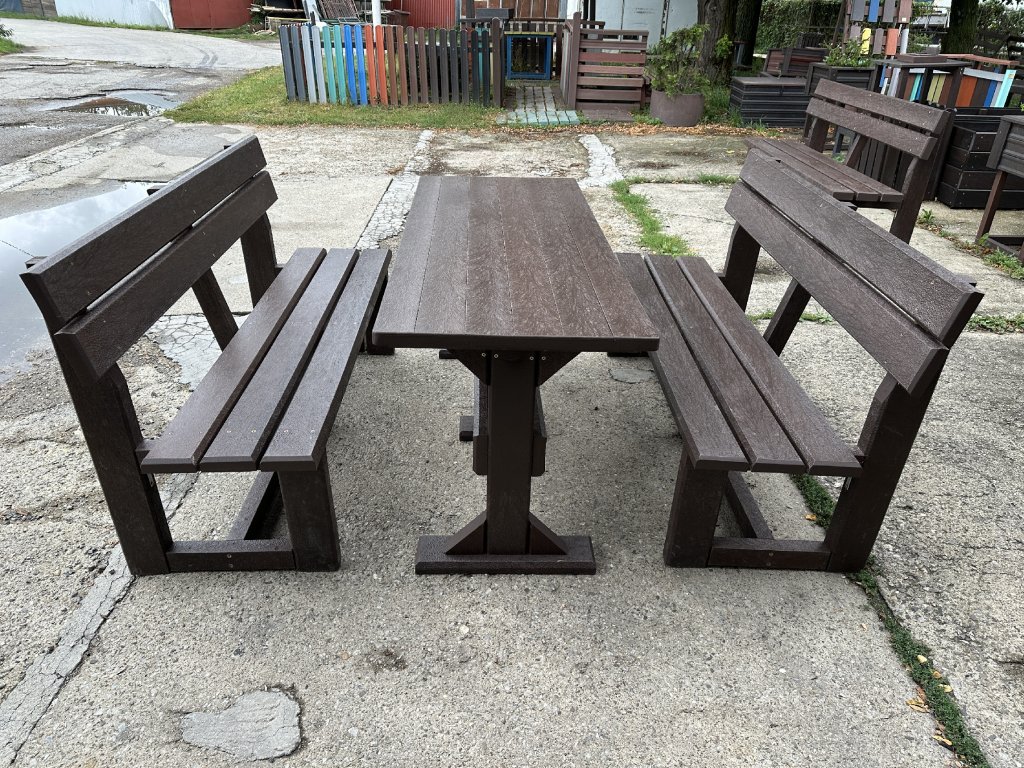 Sada je vyrobená z 3,5 cm hrubých dosiek. Materiál je stálofarebný, bezúdržbový a odolný voči poveternostným vplyvom. Stôl s lavičkami sú vhodné do parkov, záhrad, školských dvorov. Za príplatok je možná aj kombinácia dvoch celoplastových lavičiek s opierkami a jednej krátkej bezopierkovej lavičky alebo dvoch celoplastových s opierkami a jednej kratšej celoplastovej s opierkou.